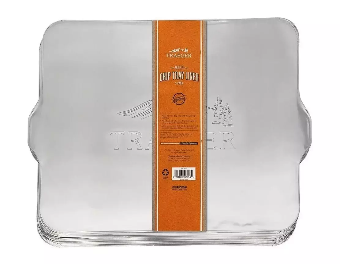 De Drip tray liner 5pack pro575 is van het merk Traeger. Deze vet-afdruipplaat past op de Traeger Pro 575 pelletbarbecue en is hittebestendig. De plaat zorgt ervoor dat de barbecue minder vies wordt en daardoor wordt het schoonmaken een stuk makkelijker. De plaat is gemaakt van aluminium en kan na gebruik weggegooid worden. De afmetingen van de plaat zijn als volgt: 55,9 cm x 39,4 cm, er zitten 5 platen in één verpakking.
