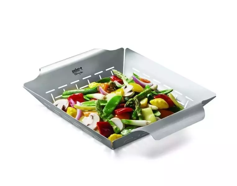 Snijd de groenten (in blokjes) en doe ze in de groentekorf. Plaats de groentekorf bij het hoofdgerecht op de barbecue. Vervaardigd van roestvrij staal. Afmetingen: 6,0 (H) x 29,5 (B) x 35,0 (D) cm.