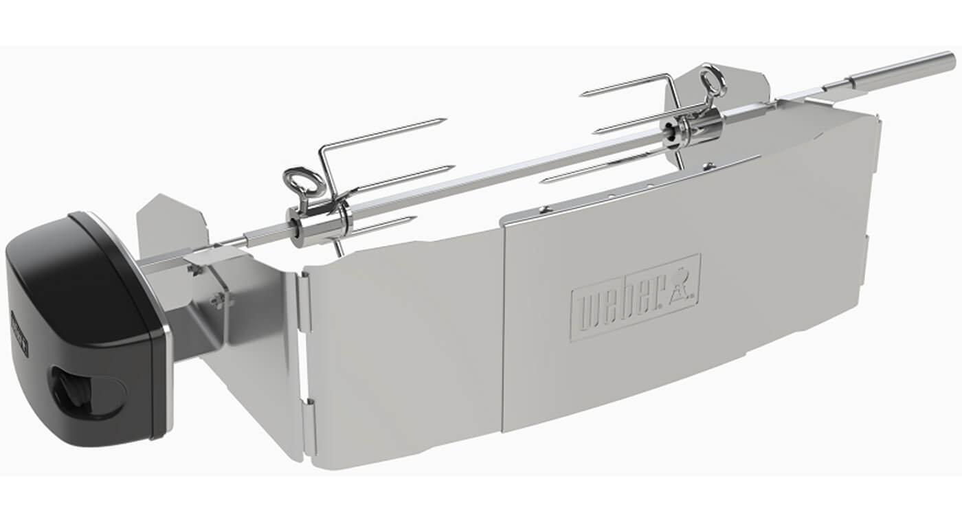 De Weber Braadspit maakt van jouw barbecue een rotisserie-oven. Rooster langzaam een hele kip of malse ribbetjes. Het af te sluiten schild zorgt ervoor dat de warmte binnenblijft, waardoor het vlees gelijkmatig wordt gegaard en de sappen bewaard blijven. De spiesen zorgen ervoor dat uw gerecht op zijn plek blijft en rond draait boven de barbecue.