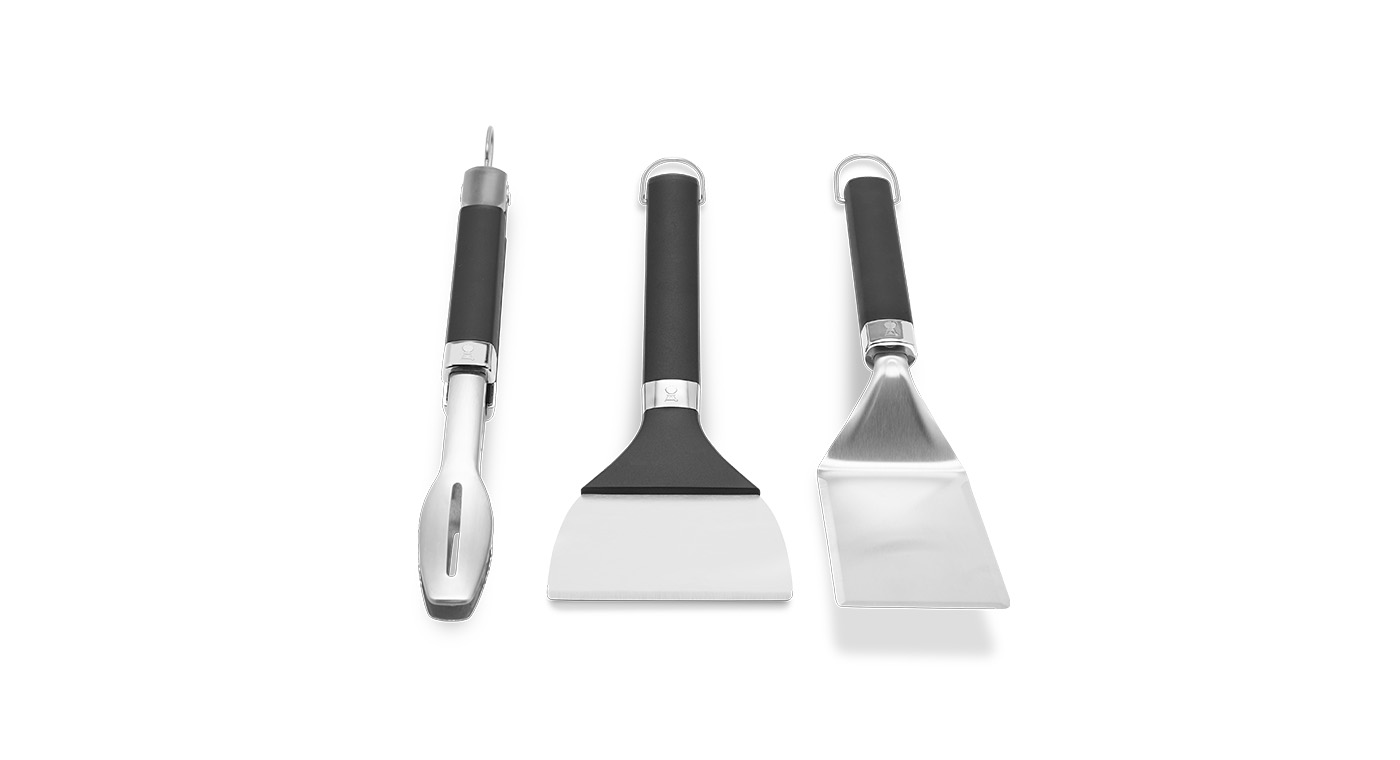Alles wat je nodig hebt voor een barbecuesessie onderweg. De draagbare gereedschapsset voor de bakplaat bevat een compacte spatel, tang en schraper die perfect zijn om mee te nemen naar je volgende kampeeruitje of picknick. Als je weer thuis bent, stop je de tools gewoon in de vaatwasser om ze gemakkelijk schoon te maken.